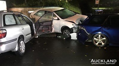 This morning's motor vehicle accident in Mt Albert Road, Mt Roskill, left a youth with serious injuries and damage to 6 vehicles. A station wagon crashed into a car, one of five, parked at the kerb. The force on impact caused a shunting effect, propelling one car into another, a series of "rear-enders" until all 5 parked vehicles were involved, some with major damage. Members helped at the scene with lighting and road closures while police investigated.