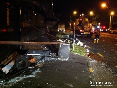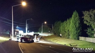 "); document.write("The Brigade's busy weekend concluded with a call to a spectacular mid-evening motor accident in View Road, Mt Eden. Although no one was trapped in the crashed car, nor seriously injured, the crash left wreckage strewn across the road: members closed the road until the scene was cleaned up and a fallen power pole removed. Debris resulted when the car crashed into a parked car, a bus stop and a power pole. "); document.write("