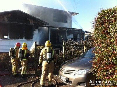 And just after 5pm a second alarm was transmitted for another house fire, this time in Mt Albert. Members at first closed busy Hendon Avenue to all traffic with a diversion, later they opened the road to Westbound traffic. Once firefighting had concluded and hoses and appliances were moved from the roadway the road was reopened. ");