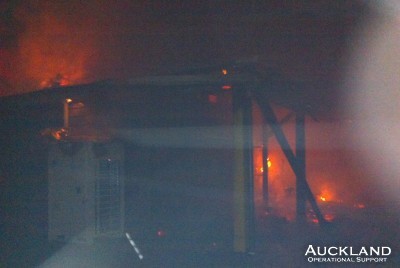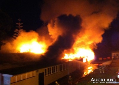 "); document.write("Northcote College's technology block, including a carpentry workshop, was destroyed by fire last night in a blaze that resulted in a 3rd Alarm by the Fire Service. The 100m x 40m two-storeyed wooden structure was well alight - the glow and smoke attracting a large crowd. Firefighters ran out hoses to obtain water from Onewa Road, piping supply to the technology block which is in the heart of the College property, surrounded by other buildings. They were unaffected by the fire. The swimming pool was used as an additional water source. Members, joined by their colleagues from the Silverdale Unit were engaged in many fireground tasks: refreshments, lighting, assisting with feeders, at the command unit and traffic management. "); document.write("