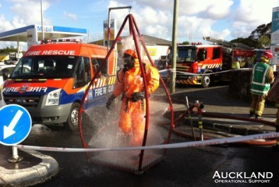 "); document.write("Members closed part of Grange Road, Mt Eden, this afternoon during Fire Service activities in doctors' surgeries at the corner of Mt Eden Road. The call was to a small chemical spillage. Two firefighters at the centre of operations wore full protective over-suits and once the spillage was dealt with they went through the decontamination shower. Duties for Operational Support personnel were traffic management (activities continued through the evening rush-hours) and scene protection. "); document.write("