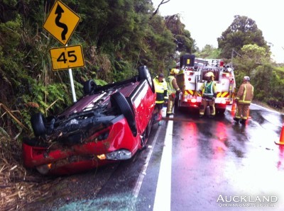 "); document.write("In the 3rd long-duration job this week, members assisted at a motor vehicle accident on the Piha Road in Waitakere Ranges last night. It occurred early in the evening during squally, stormy weather which crossed Auckland. The driver of the car, the sole occupant, was taken to hospital for examination, having escaped from her overturned car. Members and personnel from Waiatarua Volunteer Fire Brigade set up an alternating flow (Stop/Go) system to keep the road open since it's the only route to and from Piha. However, some holdups were necessary while the car was salvaged and, later, while absorbent material was spread on a section of the road to soak up an extensive oil spill. "); document.write("
