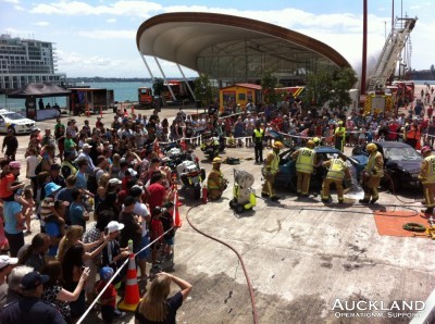 Our members, joined by colleagues from Silverdale, assisted during the day with traffic management on busy Quay Street, scene safety during live demonstrations and, from the mobile Canteen, catered for officials and helpers. Firefighters from City Station showed rescue techniques when, several times during the day, they extricated \"victims\" from a mock car crash. St John personnel assisted the \"patient\" throughout the process, replicating what typically occurs at these types of emergencies. Aerial appliances gave a combined display of fire-fighting power with jets of water thrust skywards. But perhaps the star of the show was an appliance seldom seen in public, a monster Rosenbauer Panther tender, recently added to the Auckland Airport Emergency Service's fleet. Named \"Waihoku\", worth more than $1m, its size meant it had to have a police escort while travelling to and from the Open Day. It too, impressed the crowds when it shot jets of water twice as high as the nearby Shed 10.
