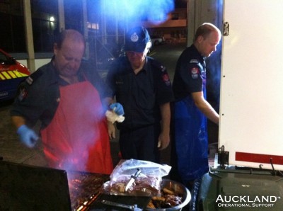 "); document.write("The Brigade's been busy with a succession of calls tonight which has kept members busy from early evening to late night. A brigade's summer barbecue function was interrupted by the first call, a truck versus power pole accident in Penrose. Greenpark Road was closed to all traffic because the pole was unstable, snapped at the base. Just as our barbecue was ending there were two simultaneous calls, one to a second alarm house fire on the North Shore at Campbells Bay where it was initially reported that the occupants may have been trapped inside the burning dwelling. In addition to usual support duties we ferried breathing apparatus cylinders for replenishment at Takapuna. The other call was also a long duration job, a major gas leak in Ponsonby Road. This necessitated traffic management, crowd control and evacuation of bars, restaurants and other business near the busy Pollen Street intersection until Vector workmen could stem the leak. The fourth callout tonight was to Coxhead Road in Manurewa, but this turned out to be a small fire. "); document.write("