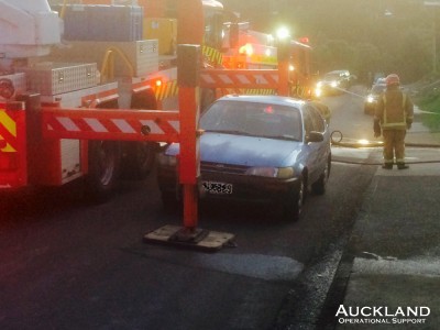 "); document.write("Members turned out to two similar motor accidents at the same time earlier today, one in Royal Oak, the other in Henderson. In Pah Road, Royal Oak, a car smashed into a power pole fracturing it many times, bringing down high-voltage wires which were draped across the vehicle. The occupant(s) somehow managed to scramble from the debris before emergency services arrived. It's thought to have been a stolen car. At Henderson it was the same sort of scenario: car into a pole with live wires. At both locations members put in cordons and road blocks until traffic management contractors took over. Just as members were all clear of both these events the brigade responded to a woman fallen over the cliff near Ladies Bay, St Heliers. A damaged car was nearby, having crashed into a road-side safety barrier. The Fire Service's High-Angle Rescue Team joined rescue efforts and the woman was stretchered up on to Cliff Road: she was not seriously injured. "); document.write("