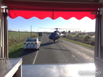 "); document.write("The mobile canteen had an unusual visitor when the police helicopter Eagle dropped in on State Highway 16 at Helensville. It was if the chopper crew recognised the canteen from above, realised they were on to a good thing and put down for morning tea of hot drinks and chocolate biscuits! In truth there had been a fatal accident along the road involving a truck-and-trailer and a car, and the police helo arrived as part of Serious Crash Unit investigations. Although a clear sunny day, it was very cold out in the open so hot drinks from the canteen were greatly appreciated by all emergency services workers at the scene. As well as attending in the canteen members maintained road blocks. "); document.write("