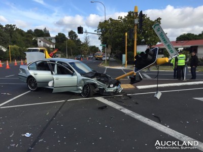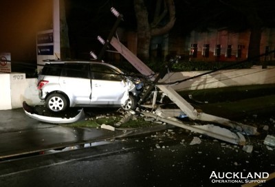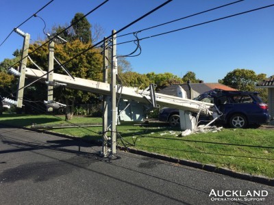 "); document.write("The driver of a stolen station wagon had a lucky escape after the vehicle slammed into a double power pole and spate telephone pole in Mt Roskill this morning. The double pole held an overhead transformer which crashed in to the street. The driver of the wagon somehow managed to make a getaway through the mangled vehicle and myriad of high-voltage power wires. Police investigating the vehicle said it had been stolen and had un-matching number plates. Members cordoned Duke Street for several hours until a traffic management company took over. "); document.write("