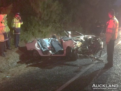 "); document.write("A car collided with a tree in Kirkbride Road last night, ending up wrapped around a Pohutukawa, totally enveloped by the tree's limbs and branches. One person was quickly rescued from the wreckage but another occupant was trapped. Firefighters used a chainsaw to remove several branches from the tree to enable better access for St John personnel to treat the patient. Meantime, other firefighters prepared a wire rope and winch, a Tirfor (R), to inch the vehicle clear of the tree so the severely injured man could be extricated, treated at the scene and removed to hospital. Members assisted - lighting the scene and closing Kirkbride Road for two hours until operations ended. "); document.write("
