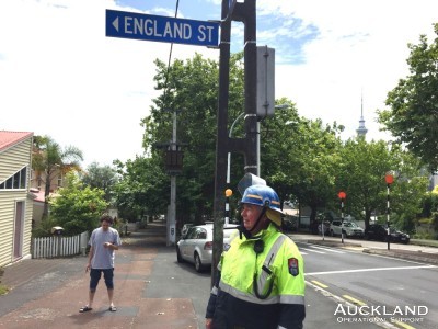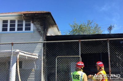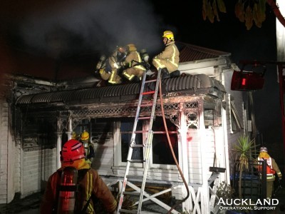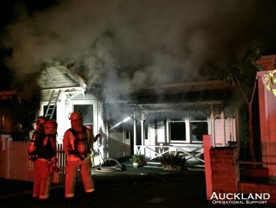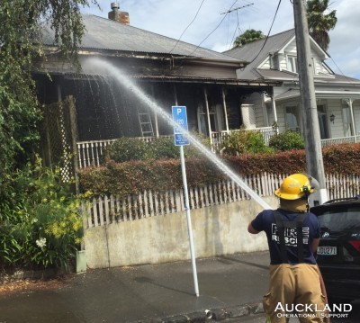 "); document.write("Today's house fire was in one of the older parts of Auckland, Freemans Bay, where hundred-year-old-plus Kauri-timbered bungalows line the streets, some built very close together. So it was a good save by firefighters to keep the flames from spreading from the blazing house to the neighbour's, no more than a metre apart. The front of the house. recently renovated, was gutted. Members closed England Street during firefighting operations. Given the name of the street, it was entirely appropriate that Station Officer Chris England led our team at the scene! "); document.write("