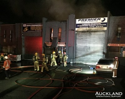 "); document.write("The fire last night at Mangere escalated to a 3rd alarm when it was realised flames were racking the building,a panel-beater's workshop. Late night work was interrupted when flames were seen. The alarm was given and fire quickly engulfed the place, venting through the roof. Firefighters mounted both ground-level and aerial attacks. Our members closed surrounding roads, but later reopened sections to enable trucks to deliver and pickup urgent freight. The canteen attended. With just a few hours' sleep, members were on the job again in Dominion Road, Mt Roskill, where a truck and a bus had collided, taking with them a power pole. Live lines fell across Dominion Road, one of Auckland's busiest routes. Once Vector electricians declared the lines safe, and with the onset of the morning rush hour, our members set up an intricate traffic management scheme, a one way arrangement down the wrong side, saving city-bound commuters a complicated detour. "); document.write("