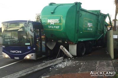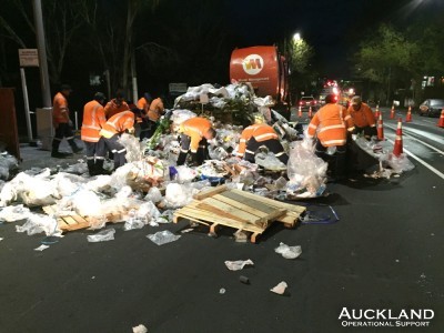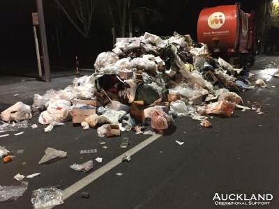 "); document.write("Members who turned up at a \"vehicle fire\" in Mt Albert early this morning got a shock when they arrived - a pile of rubbish blocking several lanes on busy New North Road. Here's the story... a fire appliance was per chance following a rubbish truck when the firefighters noticed it was on fire. The crew alerted the driver of the truck, got him to stop and tried to extinguish the blaze. It was decided the best way to get at the flames and to minimise damage to the compactor-vehicle was to empty the 6 tonnes of mixed rubbish on to the roadway. Once the fire was out a small mountain of smelling rubbish remained which was later gathered up by a team of workers. Our Members maintained traffic management throughout, across the busy morning peak traffic hours. At the same time as this callout other members were attending a car vs house motor vehicle accident in Papatoetoe while two of our vehicles responded to a third alarm structure fire at Pukekohe "); document.write("