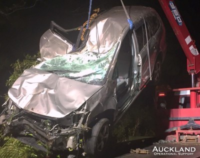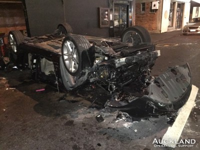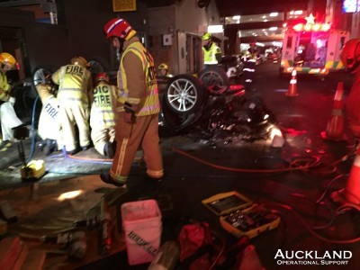 "); document.write("Our callout tonight was the result of a car plunging 6 levels from a Newmarket car park into York Street. The car swept away a concrete buttress in the car park before smashing through the railings. As it fell it hit a car parked on York Street - its two occupants escaped injury. The airborne car hit the road and flipped over, landing upside down, trapping two people in the crushed vehicle. Firefighters cut out them out and they were taken to hospital with serious injuries. Members assisted with road closures in Khyber Pass Road and Teed Street and provided lighting. Other members attended a second call at the same time, to a fire in a motel in Mt Wellington. "); document.write("