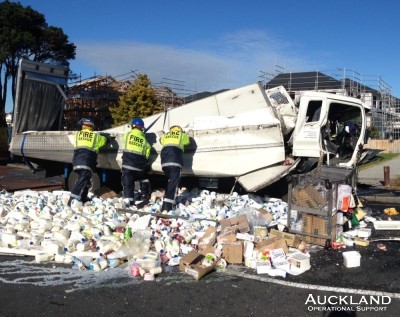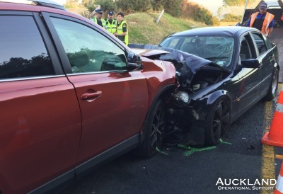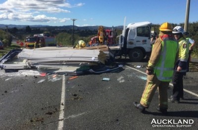 The first on the outskirts of Pukekohe left the damaged car in a paddock and the highway blocked by the truck, and its contents -- which included a house load of insulation wall board. Despite the truck rolling and the car ending up much the worse for impact, no one was seriously injured.