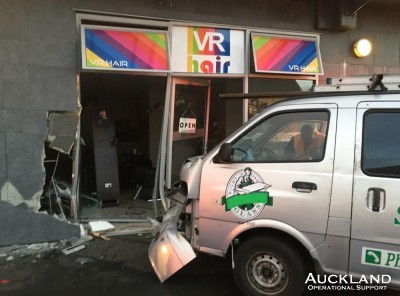 "); document.write("Firefighters extricated the driver of a trades van that crashed into a hairdresser's shop in Kingsland earlier this morning. The local glazing company's van smashed through the front glass windows and surrounds of the New North Road shop before coming to a halt just inside the premises. The van was first winched out of the shop, allowing rescuers to get to the driver who was freed and transferred to hospital. Morning peak hour traffic was disrupted by the accident with reduced lanes near Bond Street and Sandringham Road: members cordoned off the scene and kept vehicles moving around it. "); document.write("