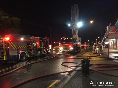 "); document.write(""); document.write(""); document.write("A second alarm event resulted from today's early morning road accident and fire in Portage Road, Papatoetoe, which left one person dead. A car smashed into a Fish and Chip Takeaway shop at the Station Road intersection, rupturing a gas pipe which ignited, setting fire to the block of shops and the car. Members assisted with lighting and traffic control until workmen shut off the gas and firefighters dealt with the flames. A traffic management company took over - the busy road will be closed for some hours while police investigate the cause of the accident. The Fish and Chip shop was destroyed: the other 5 stores all suffered fire, heat, smoke and water damage. "); document.write("