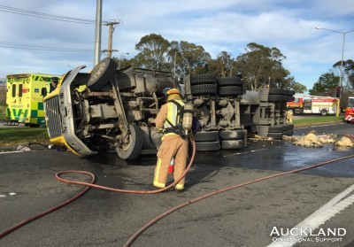 "); document.write("Members spent most of the day assisting at a road accident at Wiri in South Auckland where a tanker carrying waste overturned as it negotiated the corner of Roscommon and Wiri Station Roads. The driver was trapped inside the cab for more than half an hour before being extricated by firefighters. Meanwhile, others blocked drains and gutters to contain the unknown contents of the tank. The driver was not badly hurt but his departure to hospital began the long task to clean up the scene... to recover spilled product, drain the remainder from the tanker, pick up debris and then right the vehicle so it could be towed away. It was a long duration job - our members were on location for some 7 hours until the road was cleared, involved with traffic management, scene protection and providing meals from the mobile canteen. "); document.write("