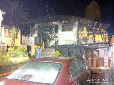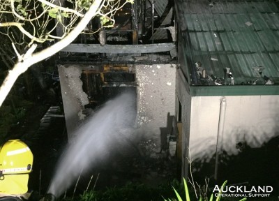 "); document.write("Four people were taken to hospital from today's early-morning fire at Albany which destroyed a two-storey house in Bushland Park Drive. It was situated at the top of a steep, shared, driveway and it's thought gusty winds at the time, around 1.30am, fanned the flames which quickly enveloped the whole house. Four occupants, two in a serious condition, were taken from the scene by St John. Fire officers escalated the call-out to a Third Alarm as multiple hose lines were run out up the driveway and across neighbouring gardens to the burning house. Members, joined by colleagues from Silverdale Operational Support, assisted with a range of Third Alarm duties including helping evacuate one of the patients. "); document.write("
