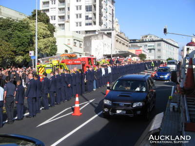 Members closed busy Pitt Street in the city this afternoon to enable full honours to be accorded to Station Officer James Young as he left City Station on his last call. James, 40, who worked out of Birkenhead Station, died after a brief illness. More than 500 attended his service. Operational Support members closed Pitt Street so James