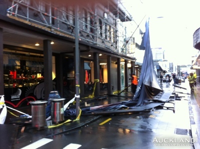 High winds and heavy winds were experienced in many parts of Auckland late this afternoon. Power wires came down, roofs dislodged, trees blown over and, in Newmarket, a giant sign was caught in a gust. Measuring some 10m by 5m the fabric sign, together with its wooden frame, was dislodged from scaffolding across the face of a building, crashing to the footpath and on to the roadway in Teed Street. Evening peak-hour traffic in Broadway was blocked by fire appliances in busy city-bound lanes and congestion quickly spread to neighbouring streets. Members managed to keep evening peak-hour traffic moving and closed off Teed Street until workmen removed debris and checked that the scaffolding had not been affected by the storm. Members responded at the same time to power lines down in Campbell Road, Greenlane, necessitating a road closure.