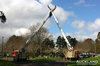 The late Kevin Nickless was the man to turn to when it came to servicing and fixing aerial fire appliances. There wasn't much about the workings of a turntable ladder, a Snorkel or an Aerialscope that Kevin didn't know about after years of working with these high-reach machines at the workshops in Otahuhu. So it was fitting that fire-fighters mounted their own salute to Kevin's long association with these specialist appliances when they arranged an elevated arch through which Kevin travelled as he made his Last Call. He died this week aged 56. Firefighters also formed a Guard of Honour outside the chapel before the service was held, led by our Brigade's Senior Station Officer, Anglican Bishop of Auckland, Rt Rev Ross Bay.