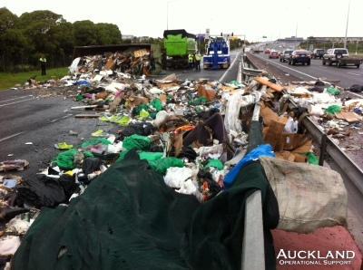 Today's long-duration call in streets leading to the Onehunga On Ramp for SH20 was really about a load of rubbish. A truck and trailer unit carrying household rubbish went out of control negotiating the Southbound On Ramp. The trailer struck the guard rail, bounced off, overturned, spilling some of its 20 tonne load, strewn across the roadway. Members closed surrounding rstreets and took up point duty at 4 intersections to clear an initial backlog, then maintained traffic management for 5 hours while the vehicle was salvaged and the road cleared of the smelly rubbish. Among motorists inconvenienced were those heading to the Airport. A detour was signposted.