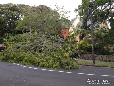 Stormy weather has resulted in an increase in operational tempo for New Zealand Fire Service resources across the region. In Mt Eden, Operational Support were called to ensure the safety of the public when a large tree, aided by strong wind gusts, split itself nearly down the middle. Neighbours reported a loud creaking noise that sounded like 'the next-door house losing its second story'! The tree was in the property of the St Barnabas Anglican Church on the corner of Mt Eden Rd and Bellevue Road, and power lines downed by the sizable piece of timber not only posed an immediate danger to passers-by, but caused live wires to land on several parked motor vehicles. One of these was substantially damaged by rigging pulled down from a nearby power pole, but fortunately the tree caused no other damage to people or property. Members of our brigade ensured the scene was safe until the arrival of Vector and their traffic management contractors.