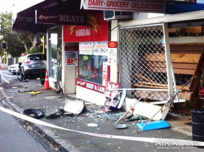 A dairy in Remuera Road had an unexpected intruder this afternoon when a car crashed through the shop's front window. The driver lost control of her vehicle at the Bassett Road intersection, crossed lanes, mounted the footpath and smashed into the premises. The car then glanced along the shop-front, missing the butcher's, coming to rest against a traffic light standard outside the corner liquor shop. The out-of-control car also damaged a power plinth on the footpath. The driver was taken to hospital: members managed busy Saturday afternoon traffic in the vicinity while the car was recovered and the scene made safe.