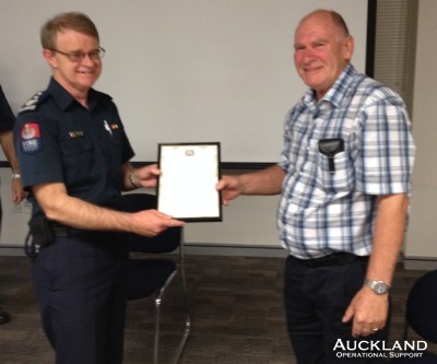 At its last meeting for the year the Brigade tonight honoured one of its former members who went on to a distinguished career in the Fire Service and recently retired. Ray Coleman served in the forerunner of Operational Support, the Volunteer Fire Police Corps, which he joined in 1970 responding from his home in Avondale. Ray then enlisted in the service fulltime and, after a period fire-fighting decided to focus on fire prevention and investigations. This lead to further specialisation and study in the USA, resulting in a formal intervention programme for young people involved in fire-setting and inappropriate fire-play. In 2004 he received the Queen's Service Medal in the Queen's Birthday Royal Honours list. Tonight Chief Fire Officer Glenn Teal, on behalf of the Brigade, presented Ray with a certificate honouring 40 years' service, just a tad late because his total volunteer and career service spanned 42 and a half years.