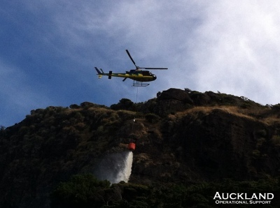 Helicopter with monsoon bucket douses the Karekare scrubfire.