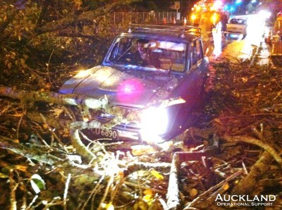 Our members have responded to six calls during tonight's stormy conditions. The first was to a large tree which blew down, engulfing a car and blocking all 4 lanes on Great North Road, Waterview. The driver of the car was lucky... the tree collapsed right in front of him and, unavoidably, he ploughed into the branches, the car becoming jammed in the foliage. But fortunately the weight of a main branch was taken by the car's roof above the rear window and the driver was uninjured. Members closed Great North Road until arborists arrived and a traffic management company took over. At the same time other members answered a call further along Great North Road between New Lynn and Kelston where a car collided with a wall. We also responded to Whitford where a power pole was on fire and a road closure required, to power wires down in Murrays Bay and Favona and a large tree across the road at Mt Albert.
