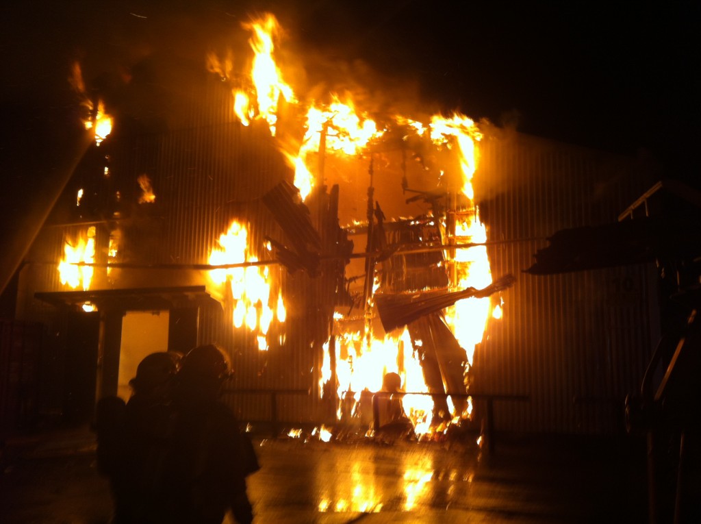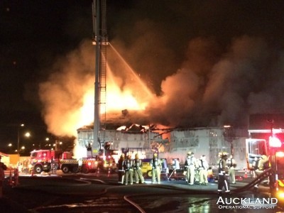 One of the biggest fires in West Auckland in years has overnight destroyed one of the largest buildings at Auckland Film Studios' Henderson complex. The blaze ripped through the 3 storey-high corrugated iron structure which at one end contained a gym where flying stunts and sequences were arranged while the other end was a workshop where film props and scenery were made and stored.