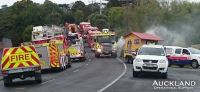 Helensville Volunteer Fire Brigade celebrates its centenary this weekend with activities to mark the milestone. This morning there was a parade of fire appliances, big and small, through the town. Our members took the mobile Canteen, and, of course, the Wendy House - smoking as usual - made its appearance. Helensville's volunteer brigade began in 1915 under Captain A. G. Robinson but firemen had to wait until March 1917 for their first serious blaze, a fire in the upper structure and decking of the "Bellbird" tied up alongside the Railway Wharf. The brigade was credited with "a good save" by the Press at the time.