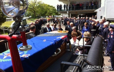 Our Brigade was represented at the funeral in Hamilton this morning of former Fire Commander Emrys Evans, QFSM, who died aged 88 at the weekend. Emrys emigrated with his family from Wales in 1928. In 1953 he joined East Coast Bays Volunteer Fire Brigade and then served in many North Island brigades after he had chosen the Fire Service as his career. He retired in 1977 as Commander, Waikato. Emrys was very much involved in the United Fire Brigades' Association having served in practically every office in the organisation and its affiliates, including President and Chairman of the Benevolent Trust Fund. Until this year he had attended every UFBA annual conference for 55 years. Emrys made his Last Call aboard Cambridge Fire Brigade's 1938 Ford V8 appliance.