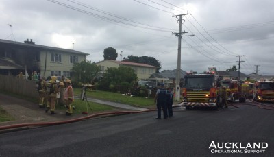 Several occupants were rescued in today's house fire at Mt Wellington - but a man, a woman and an infant are hospitalised with severe burns. The morning blaze, in a two storeyed unit in Malone Road, ripped through the residence catching several people inside. Some were dropped from the first floor to neighbours' waiting arms while others were rescued and taken out on to the lawn. An infant was resuscitated by firefighters before being taken to hospital. Members closed the road during the second alarm emergency and provided other support services.
