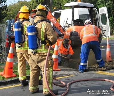 Members put in multiple road closures mid-afternoon at a hazardous situation in Mt Eden after workmen pierced a gas pipe. Busy Mt Eden Road was closed at St Leonards Road and Duke Street while Landscape Road was also blocked by Fire Police until Vector staff arrived, excavated, found the damaged pipe and clamped it, preparatory to repairs. Meanwhile, the leak roared as it gushed out the hole and vented to the air. All traffic and pedestrians were diverted. The all-clear was given in time for roads to be reopened for evening peak-hour traffic.