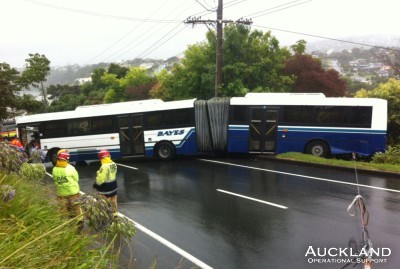 The brigade had members at three calls at once this evening, and all were motor vehicle accidents. The first was in Atkinson Road, Titirangi, a serious crash, where a car had run off into a ditch leaving an elderly man with head injuries. The road was blocked until the patient left the scene and police carried out investigations. The second was a call for assistance by Silverdale Operational Support at a crash on Whangaparaoa Road, Tindalls Beach. A bus, one of the longest bendy-buses, had lost control, sliding down a steep part of the road until it was at right angles across the roadway and hit a power pole, snapping it at the base. No one was injured but the bus which blocked the main road from kerb to kerb could not be moved until the power pole was stabilised. This occurred on a stretch of the peninsula road where no diversions are possible so motorists had to wait for hours until the situation was made safe and the bus removed. The canteen also responded to this long duration job.