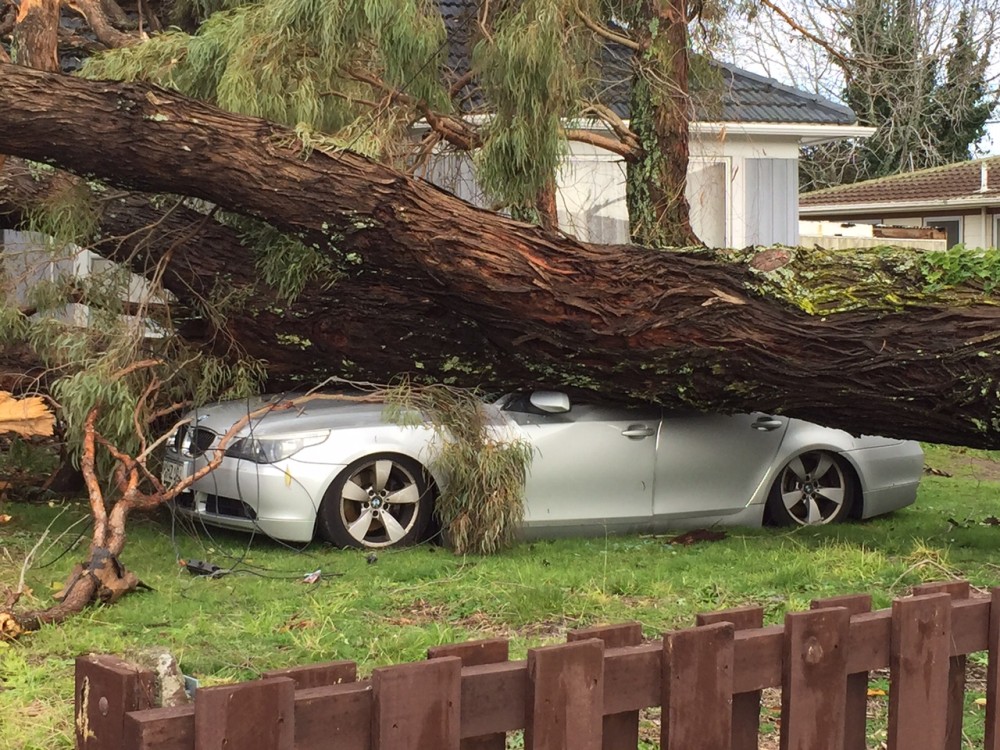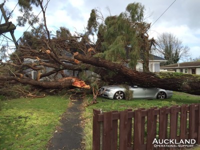 Very heavy rain, combined with powerful wind gusts and what have been described as "mini-tornadoes" caused widespread damage in many parts of Auckland today. Members responded to several incidents, including one at Papatoetoe where freak gusts felled a large tree. Its upper limbs crashed into a house breaking roof tiles but the trunk landed atop a late model BMW car parked on the front lawn. The tree also took out power lines blacking-out neighbouring houses. Members waited until Vector staff made the lines safe and firefighters had trimmed the tree. Arborists are dealing with the rest.