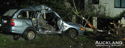 Station wagon vs tree. The felled tree's roots are seen to the right