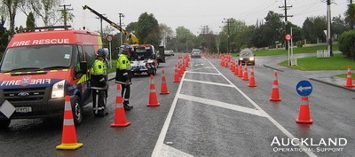 Members mounted a traffic management operation in Ranui this morning to assist morning commuters. Rather than road closures at the scene of a single vehicle accident on Swanson Road, Fire Police created temporary lanes near Airdrie Road so that traffic could continue to flow without disturbing the scene and endangering police who were investigating the crash. A station wagon, earlier sought by police, clipped a traffic island and, out of control, crossed the road, mounted the footpath and crashed into a tree, uprooting it. Firefighters freed the occupants, some badly injured. Two Fire Police vehicles attended: they were both stripped of every cone they carried, enabling the temporary traffic management to be put in place.