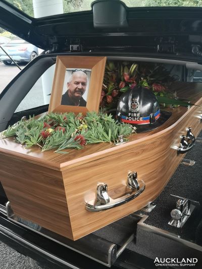 Family and friends gathered today for the funeral of our past member, Grant Wilson, who died last week in Waikato Hospital aged 63. The service was held at Crossroads Church in Mangatangi, South Auckland, where Grant had recently been living, supported by the locals, especially the church community. Our brigade, and Mangatangi Volunteer Fire Brigade, was represented at the funeral. Grant's public service began when he was a teenager as a Scout Leader in Mt Albert and then in 1978 he joined the then Auckland Fire Police Corps (now Operational Support), a member for some 30 years. Suffering poor health, he moved to South Auckland, lived in Te Kauwhata and Pokeno for a time before moving to Mangatangi. His enthusiastic heydays as a dedicated member of the fire service were recalled by his black Fire Police helmet which adorned the casket.